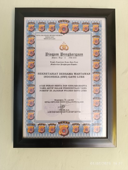 Gayo Lues, Aceh – Sebagai wujud apresiasi atas peran serta dan kerja sama yang aktif dalam mendukung pemberitaan positif, Kepolisian Resor (Polres) Gayo Lues telah memberikan Piagam Penghargaan kepada Dewan Pimpinan Daerah (DPD) Sekber Wartawan Indonesia (SWI) Kabupaten Gayo Lues. Penyerahan penghargaan ini berlangsung di Blangkejeren pada Selasa (01/07/2025) Sore.