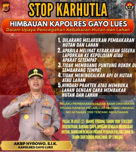 Gayo Lues – Di tengah indahnya alam Gayo Lues, ada satu ancaman yang selalu mengintai: kebakaran hutan dan lahan (Karhutla). Menyikapi hal ini, Kapolres Gayo Lues, AKBP. HYROWO, SIK, mengajak seluruh masyarakat untuk bergandengan tangan, menjadi garda terdepan dalam menjaga paru-paru dunia kita, Jum’at (04/07/2025).