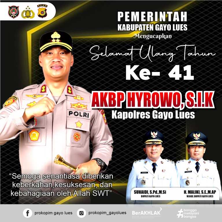 Selamat ulang tahun yang ke-41 kepada AKBP Hyrowo, S.I.K. Kapolres Gayo Lues. Semoga Allah SWT senantiasa melimpahkan keberkahan, kesuksesan, dan kebahagiaan dalam setiap langkah pengabdian beliau untuk bangsa, negara, dan khususnya masyarakat Kabupaten Gayo Lues. (Red)