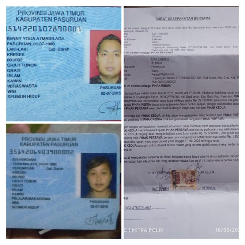 Ia menjelaskan bahwa surat perjanjian tersebut disusun secara resmi dan diketahui oleh aparat Polsek Grati, bahkan ditandatangani langsung di hadapan Kanit Reskrim setempat. Namun, terlapor dinilai tidak menunjukkan itikad baik dengan mengingkari komitmen serta terus mengumbar janji tanpa kepastian yang jelas.
