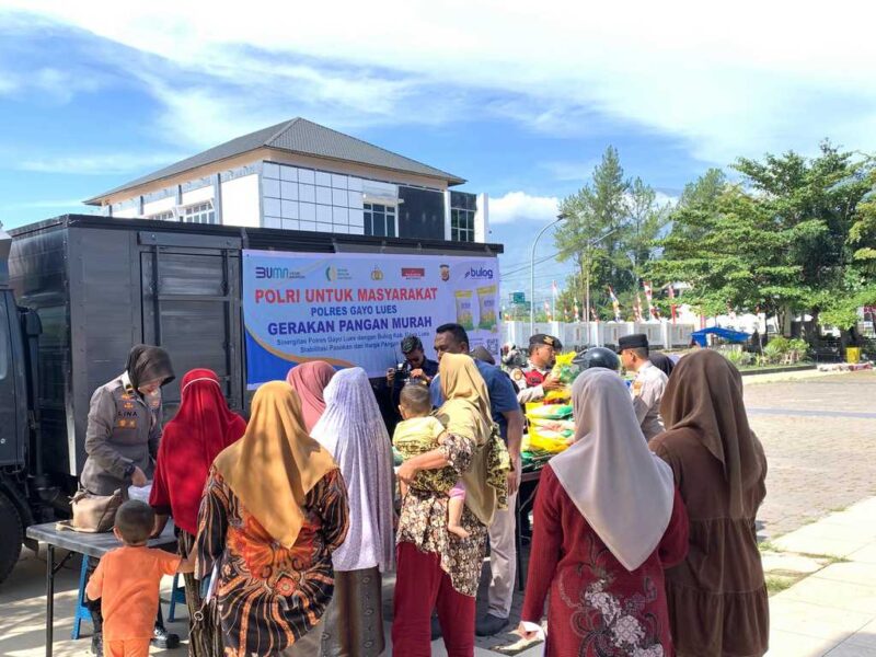 GAYO LUES | Polres Gayo Lues bekerja sama dengan Perum Bulog menyalurkan lima ton beras Stabilisasi Pasokan dan Harga Pangan (SPHP) kepada masyarakat melalui kegiatan Gerakan Pangan Murah yang digelar pada Kamis, 14 Agustus 2025. Kegiatan ini tidak hanya menjadi wujud kepedulian terhadap warga di tengah harga beras yang cenderung naik, tetapi juga memantik antusiasme tinggi dari masyarakat yang sudah menunggu sejak pagi di Halaman Bale Musara, Kabupaten Gayo Lues. Sebanyak 620 sak atau setara 3.100 kilogram beras dibagikan kepada warga yang memadati lokasi acara. Sementara itu, 380 sak atau sekitar 1.900 kilogram lainnya disalurkan melalui tiga polsek jajaran—Polsek Kutapanjang, Polsek Terangun, dan Polsek Putri Betung—agar bantuan menjangkau masyarakat di berbagai pelosok.