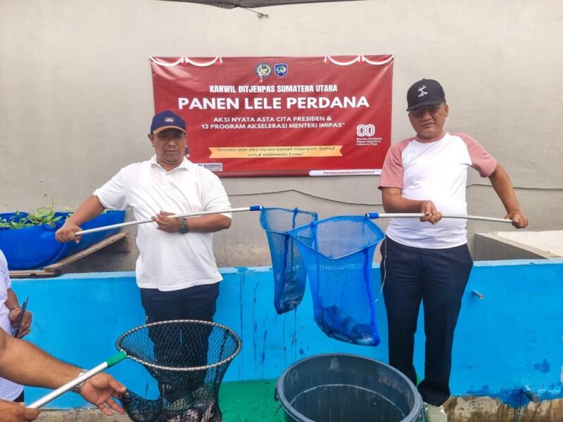 Medan | Kantor Wilayah Direktorat Jenderal Pemasyarakatan (Kanwil Ditjenpas) Sumatera Utara memanen hasil budidaya ikan lele di lahan ketahanan pangan (Ketapang) yang berada di lingkungan kantor wilayah,Jumat (15/08/2025).