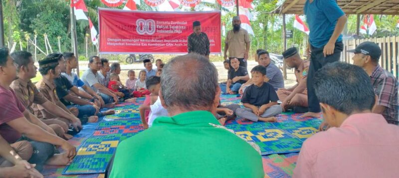 ACEH JAYA | Tokoh Exs Kombatan GAM Kabupaten Aceh Jaya Wan Khairunas alias Wan Jambang bersama dengan masyarakat Kecamatan Teunom dan Pasir Raya menggelar acara syukuran di Hari ulang Tahun Kemerdekan Republik Indonesia yang ke 80 bertempat Digampong Alue Krueng, Kecamatan Pasir Raya, Kabupaten Aceh Jaya, minggu (17/8/2025).