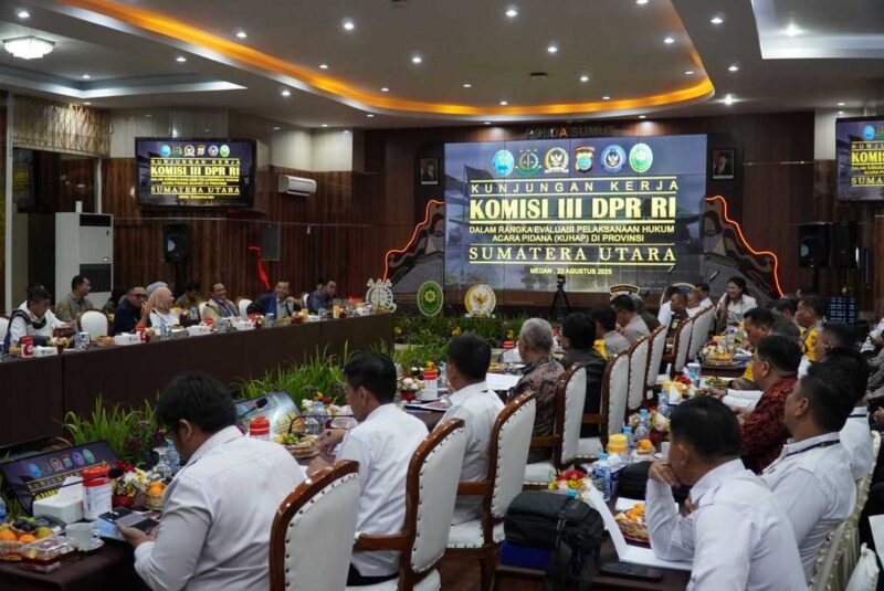MEDAN | Kegiatan Rapat Dengar Pendapat (RDP) Komisi III DPR RI dalam rangka evaluasi pelaksanaan Kitab Undang-Undang Hukum Acara Pidana (KUHAP) berlangsung di Aula Polda Sumatera Utara dengan dihadiri seluruh Forkopimda Sumut.