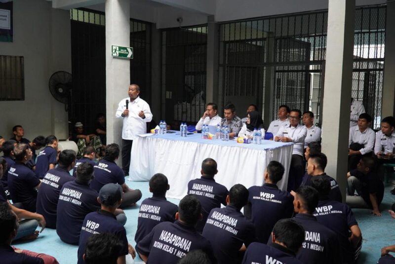Medan – Sebanyak 400 orang warga binaan Rumah Tahanan Negara (Rutan) Kelas I Medan berkumpul dalam blok untuk mengikuti kegiatan Penguatan Hak Asasi Manusia (HAM) yang diselenggarakan oleh Kanwil Kementerian HAM Sumatera Utara, dengan mengusung tema “pemenuhan hak warga binaan adalah Hak Asasi Manusia”. Selasa (26/08).