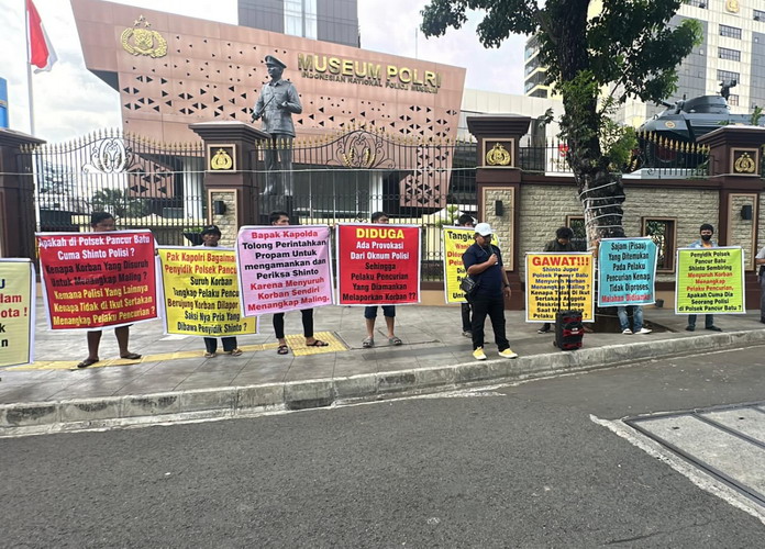 Jakarta | Korban pencurian yang disuruh penyidik Polsek Pancur Batu Brigadir Shinto Zelmana Sembiring menangkap dan mengamankan pelaku pencurian melakukan aksi Demo di Mabes Polri pada Jumat,12 Desember 2025 siang.
