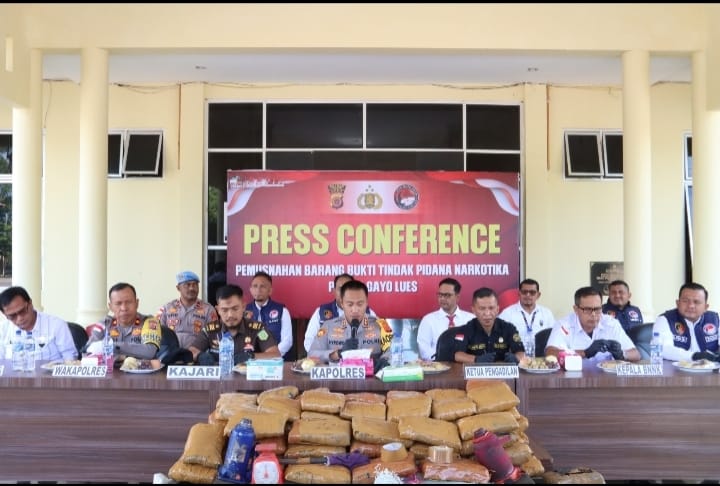 Blangkejeren, 11 Februari 2026 | Polres Gayo Lues menggelar press conference pemusnahan barang bukti tindak pidana narkotika yang berlangsung di Mapolres Gayo Lues. Kegiatan tersebut dipimpin langsung oleh Kapolres Gayo Lues AKBP Hyrowo, S.I.K., serta dihadiri unsur Forkopimda Kabupaten Gayo Lues dan instansi terkait.