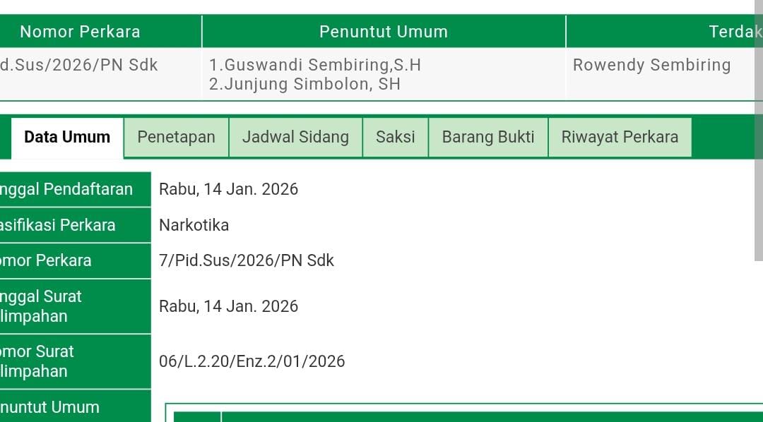 Dugaan tersebut mencuat dalam sidang perkara Nomor 6/Pid.Sus/2026/PN Sdk atas nama terdakwa Andi Puspa Ginting dan perkara Nomor 7/Pid.Sus/2026/PN Sdk atas nama Rowendi Sembiring. Sidang yang digelar pada Senin (23/02/2026) itu beragenda tambahan pembuktian dari Jaksa Penuntut Umum (JPU) dan penasihat hukum terdakwa.