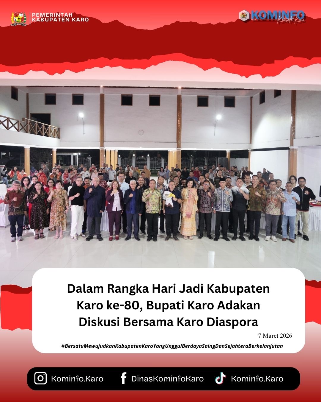 SUARABHAYANGKARA.NET | KARO – Dalam rangka memperingati Hari Jadi Pemerintah Kabupaten Karo ke-80, Bupati Karo Antonius Ginting menggelar diskusi bersama tokoh Karo diaspora dengan tema “Satu Visi Satu Langkah: Kolaborasi Tokoh Karo dan Pemerintah dalam Membangun Kabupaten Karo.” Kegiatan ini berlangsung di Jambur Pemkab Karo pada Sabtu (7/3/2026).